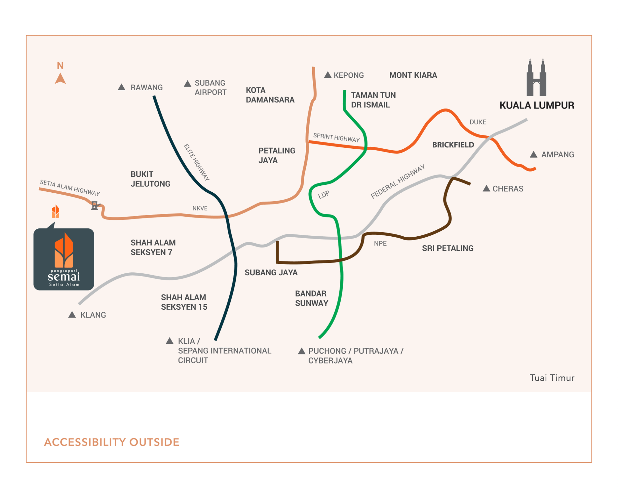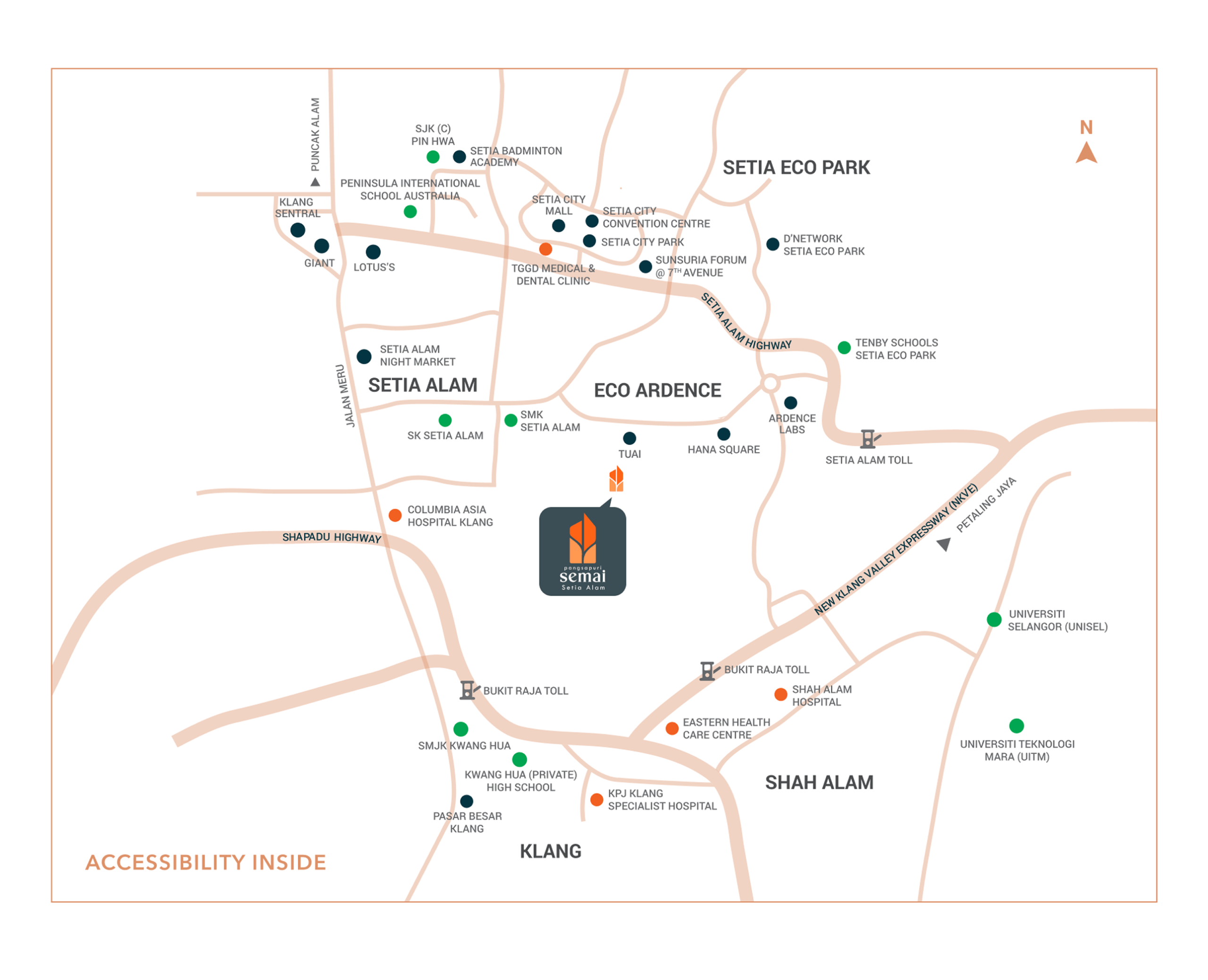 Pangsapuri Semai is located in Setia Alam next to the Eco Ardence township, approximately 30 minutes from Kuala Lumpur city centre. Pangsapuri Semai is connected via the New Klang Valley Expressway (NKVE), Shapadu Highway and the Guthrie Corridor Expressway.